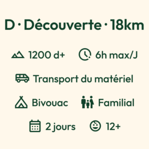 Environ 18km et 1200m de D+ (8h max sur 2 jours). Orientation de niveau facile, bivouac mais pas de portage du matériel.